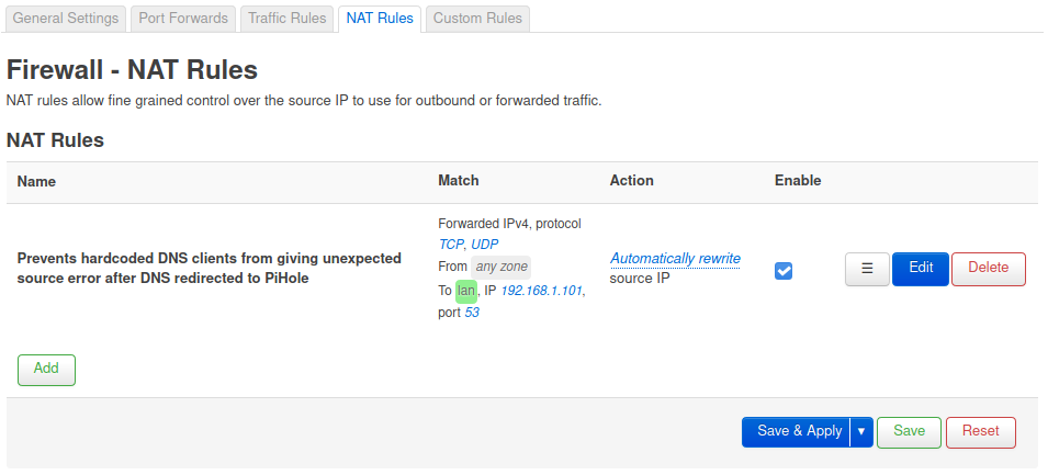 OpenWRT router under Network > Firewall > NAT Rules, I added the following rule: